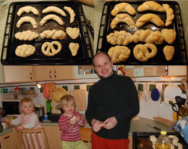 Dandy, vyrvali mi těsto na houstičky z rukou! Stihla jsem jeden rohlík, druhý musela Hanka, pak jsem ukecala manžela, že si udělám aspoň kousku, no ta teď tam spolu tvoří a teda slíbili mi, že mi něco nechají :))) Dorka všemu přihlíší ze židle a já už se do kuchymě nevejdu ... Tak doufám, že se nám povedou upéct, jinak mě proklejí :)))