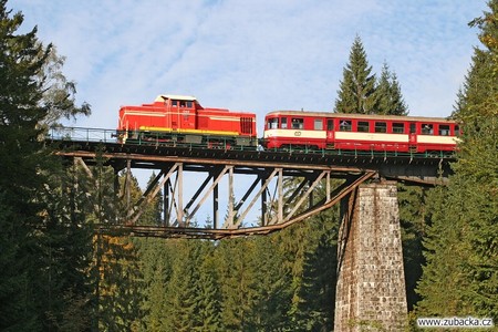 | Popis: | Jen málokterá železnice se může pyšnit tolika nej jako jizerskohorsko-krkonošská železniční trať Tanvald - Harrachov, kterou najdeme v jízdním řádu pod číslem 035. Zajímavá je nejen unikátním stavebním provedením, ale také svojí bohatou historií. Stala se pravidelným cílem cest pro obdivovatele železnice a technických památek z celé Evropy a v roce 1992 byl úsek Tanvald - Kořenov prohlášen Ministerstvem kultury ČR za kulturní památku. Dnes je v provozu 12 kilometrů trati z Tanvaldu do Harrachova, které se mezi lidmi říká "kořenovská Zubačka" nebo také "Polubenka", z původní 59km rakousko-pruské spojnice mezi Tanvaldem a Hirschbergem (dnešním polským městem Jelenia Góra). Trať z Tanvaldu do Harrachova se honosí mnoha zajímavými umělými stavbami, mimo jiné pěti tunely, z nichž nejdelší měří 940 metrů, dodnes dochovanou 4,43 km dlouhou dvoupásovou Abtovou ozubnicí v ose koleje na sedmikilometrovém úseku Tanvald - Kořenov, překonávajícím výškový rozdíl 235 metrů maximálním stoupáním až 58 promile, které je největším v České republice. Z památkově chráněného kořenovského nádraží (701 m.n.m.) železnice pokračuje táhlým obloukem ve tvaru podkovy přes 26 metrů vysoký most nad řekou Jizerou, kterým přechází z Jizerských hor do Krkonoš. Dále již osiřelé koleje pokračují z dnešní konečné v harrachovské místní části Mýtiny (740 m.n.m.) přes Novosvětský průsmyk (885 m.n.m.), dalších 15 km do polského lázeňského města a krkonošského střediska Szklarska Poreba. Odkud jezdí elektrické osobní vlaky Polských státních drah dalších 32 km do města Jelenia Góra. |