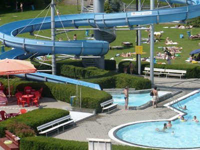 | Popis: | Moderní nové koupaliště, uvedené do provozu v roce 1996, zahrnuje plavecký bazén 25x15 m, kanál s proudem a velkou dvojskluzavkou, soustavu masážních a relaxačních bazénů s vodotryskem, vodním hřibem, masážními tryskami a podvodním osvětlením pro relaxaci, dětský bazén s vodním hřibem a dětskou skluzavkou, dojezdový bazén pro tobogán, vodní atrakce (tobogán délky 70 m, skluzavky), travnaté plochy pro odpočinek. Posilnit se také můžete občerstvením ve 3 stálých bufetech. Patříte-li mezi příznivce sportovních aktivit, pro vás je tu plážová kopaná, plážový volejbal, v blízkosti tenisové kurty, sportovní stadion, sportovní hala, sauna. Pro nejmenší je určeno dětské hřiště s prolézačkami. Ubytovat se můžete v autokempu. |